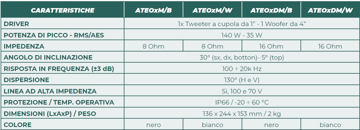 – Ampia gamma di applicazioni. Gli altoparlanti ATEOxM sono adeguati in diversi contesti, tra cui bar, ristoranti, ambienti aziendali, istituti scolastici, hotel, spazi commerciali, aree residenziali e club, nautica, sia per soluzioni indoor che outdoor;