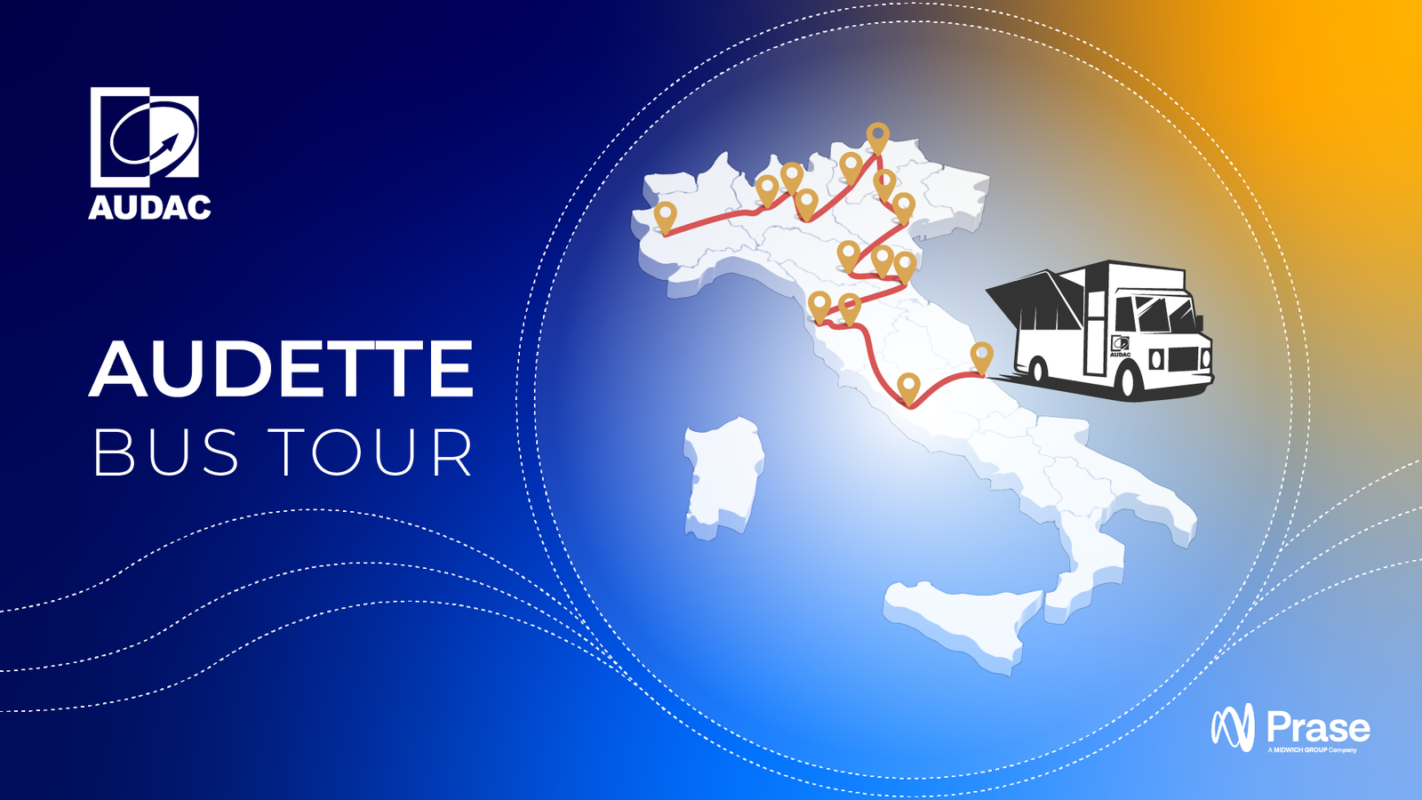 Prase e Audac, amato produttore belga di speaker e soluzioni professionali audio innovative, nel mese di giugno viaggeranno attraverso le principali città del Nord e Centro Italia a bordo di Audette, il demo-bus Audac per far testare e ascoltare le tecnologie del noto brand.