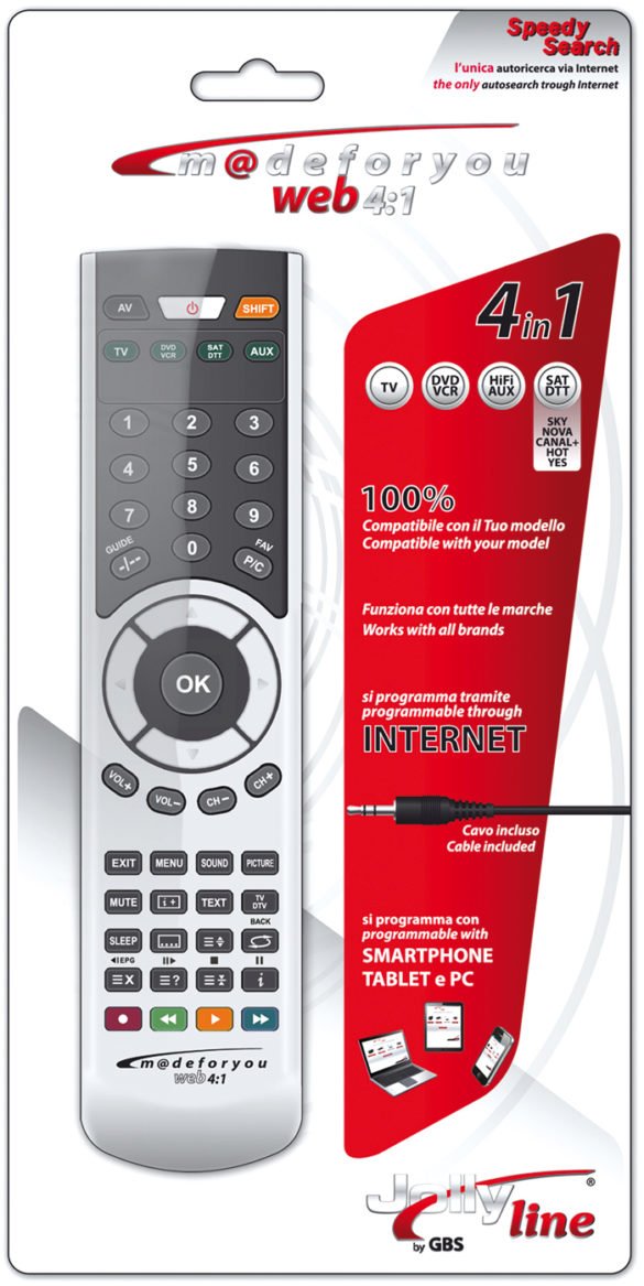 L’ultimo modello di GBS elettronica si programma con un cavo audio collegato a PC, smartphone e tablet. Via web-server si effettua il download dei codici di 4 apparecchi diversi. Il sito dedicato è: www.madeforyouweb.it Il core-business di GBS elettronica, da sempre, è focalizzato sul telecomando…