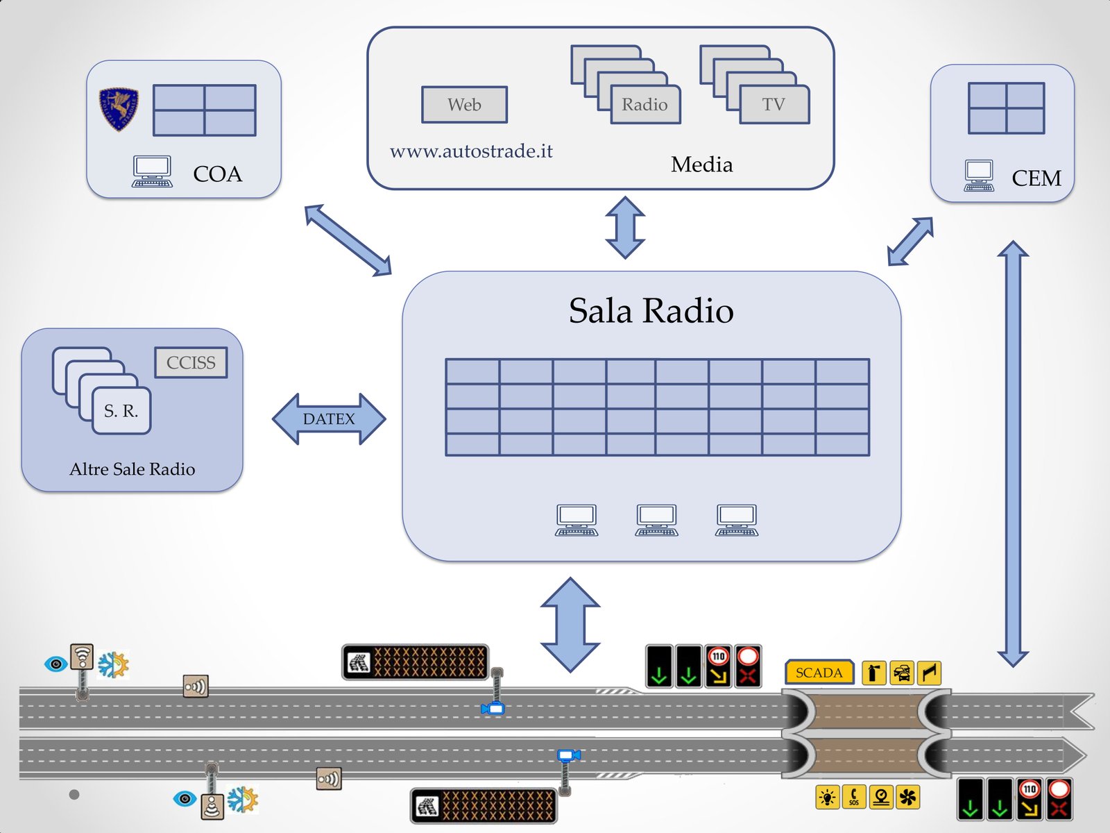 Il progetto ha richiesto l’adozione di un’interfaccia utente comune, studiata nei minimi particolari, per mettere in condizione tutti gli operatori delle diverse sale di controllo di monitorare il traffico sulle strade. Nello specifico: tutta la rete in concessione ad Autostrade per l’Italia, il tratto italiano del Traforo del Monte Bianco, il raccordo autostradale Valle d’Aosta, la tangenziale di Napoli, la società autostrade meridionali e la società autostrade tirrenica, per un totale di 3.020 km, 217 aree di servizio, 15 regioni e 60 provincie italiane.