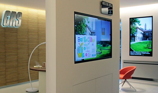 All’interno di questo layout, la comunicazione si è trasformata: niente più cartelloni pubblicitari ma monitor capaci di colpire subito l’immaginazione e catturare l’attenzione del cliente, per intrattenerlo, informarlo e alleggerire i suoi tempi di attesa. Un Digital Signage evoluto, con uno spazio anche alle comunicazioni dal territorio; ad esempio, immagini dedicate agli interventi eseguiti dalla Fondazione della Banca, per ribadire l’identità originale.