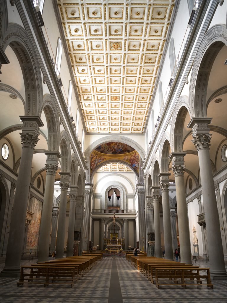 La Basilica di San Lorenzo, nel centro di Firenze, ha una storia lunga 1600 anni. L’edificio attualmente visibile risale però alla metà del Quattrocento. Fu progettato dal genio architettonico del Brunelleschi, di cui uno dei tratti distintivi è la purezza di forme, ottenuta con un ricorso essenziale agli elementi decorativi, che ritroviamo nell’uso della pietra serena grigia per le membrature architettoniche che risalta sull’intonaco chiaro delle pareti.