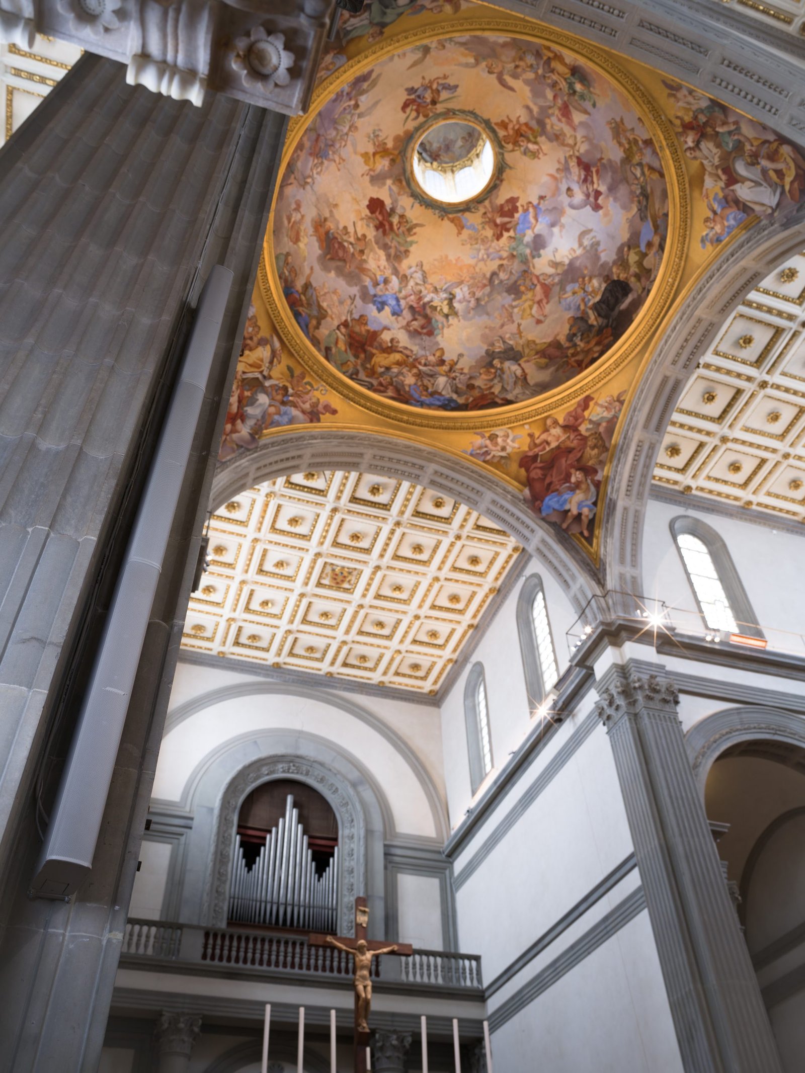 La Basilica di San Lorenzo, nel centro di Firenze, ha una storia lunga 1600 anni. L’edificio attualmente visibile risale però alla metà del Quattrocento. Fu progettato dal genio architettonico del Brunelleschi, di cui uno dei tratti distintivi è la purezza di forme, ottenuta con un ricorso essenziale agli elementi decorativi, che ritroviamo nell’uso della pietra serena grigia per le membrature architettoniche che risalta sull’intonaco chiaro delle pareti.