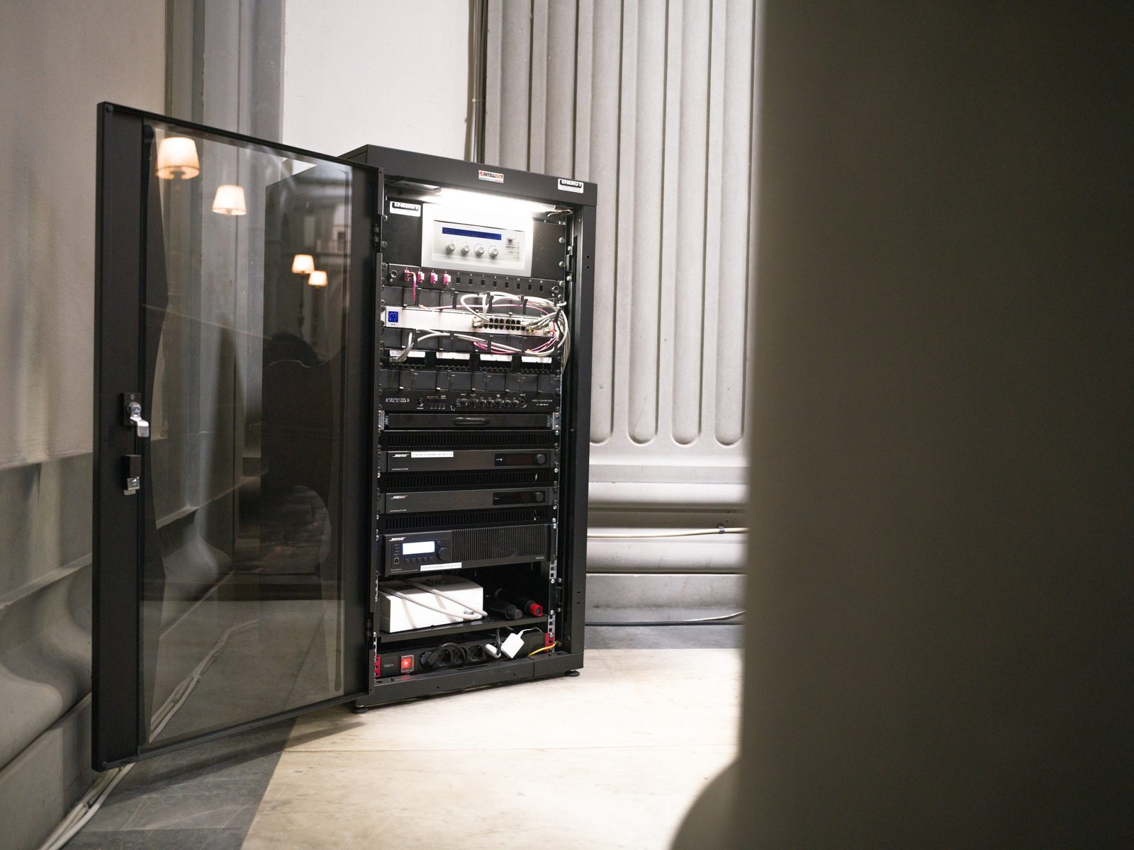 – Tre rack per organizzare l’impianto – L’impianto audio della Basilica di San Lorenzo è diviso in tre parti, a cui corrispondono altrettanti rack: uno per l’area centrale della basilica e due per le navate laterali. Quello centrale manda i segnali agli altri rack. Tutti e tre gestiscono un proprio gruppo di diffusori. Spiega ancora Canfailla: «Ogni rack ha il suo amplificatore; il cablaggio fino all’amplificatore è in fibra ottica, dopodiché si innestano semplici cavi in rame da 2,5 mm di diametro. Parliamo di 250 metri di cavi per arrivare dal rack centrale al rack laterale destro, poiché è necessario salire nella torretta e nel soffitto, per poi scendere di nuovo».