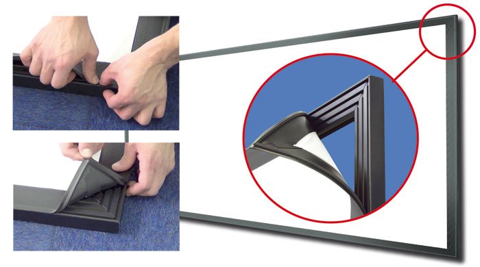 Prima si fissa al muro la cornice e poi viene applicata la tela. Un solo installatore è in grado di metterlo in opera rapidamente. La cornice nera è a filo con la tela di proiezione, non è così presente il classico scalino.