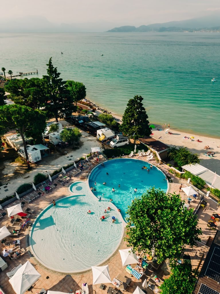 «Il nostro è stato il primo campeggio della zona sud del lago. Peschiera era un piccolo borgo di pescatori che poi si è espanso: l’espansione ha tuttavia lasciato intatta la porzione di terreno, di un ettaro e mezzo, che mio nonno aveva acquistato in un periodo nel quale si ricominciava a vedere la luce dopo la guerra. Il nonno era marinaio, aveva girato parecchio arrivando fino in Cina, e proprio ai suoi viaggi è dovuta la sua grande apertura mentale. Fin dall’inizio aveva l’idea di accogliere clienti soprattutto di provenienza tedesca, che all’epoca arrivavano con piccole macchine e sidecar, e alloggiavano in tenda. Su quel pezzo di terra sono poi stati aggiunti piccoli servizi – per esempio i blocchi igienici–, casette e bungalow, che sono poi diventati casette con bagno (qualcosa di avveniristico negli anni Sessanta, quando il bagno non c’era nemmeno in tutte le abitazioni). Sono arrivati poi il bar, il servizio ristorazione, i punti panoramici. Negli ultimi trent’anni, la prima piscina e servizi accessori per gli ospiti, mentre nell’ultimo decennio abbiamo rivoluzionato nuovamente il campeggio grazie alla voglia, alla capacità e alle intuizioni della terza generazione. Parliamo di trasformazioni strutturali: case moderne e confortevoli, una piscina panoramica riscaldata, un parco giochi completamente in legno, un bar con ristorante, piazzole riqualificate – tutte hanno acqua, scarico, elettricità, copertura Wi-Fi gratuita –, e tutti gli alloggi sono pet-friendly».