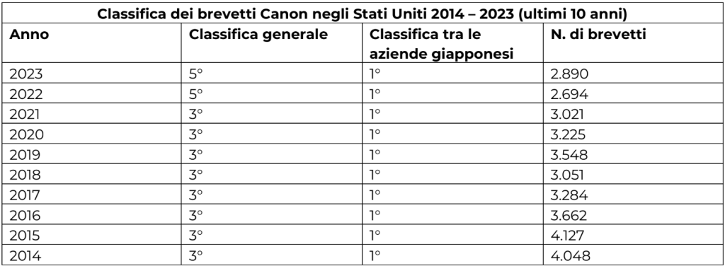 Notizie dal mondo Canon. Da 38 anni consecutivi Canon è nelle prime cinque posizioni della prestigiosa classifica stilata da IFI Claims Patent Services che, con cadenza annuale, raccoglie i 50 principali assegnatari di brevetti tecnologici rilasciati negli Stati Uniti.