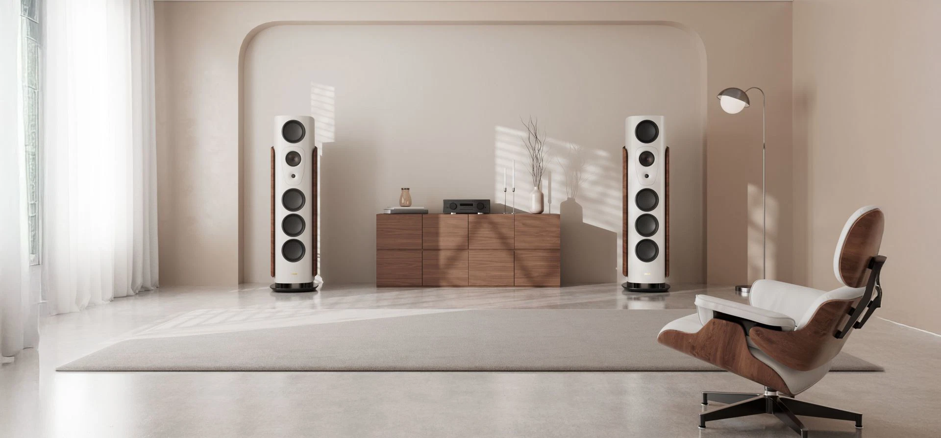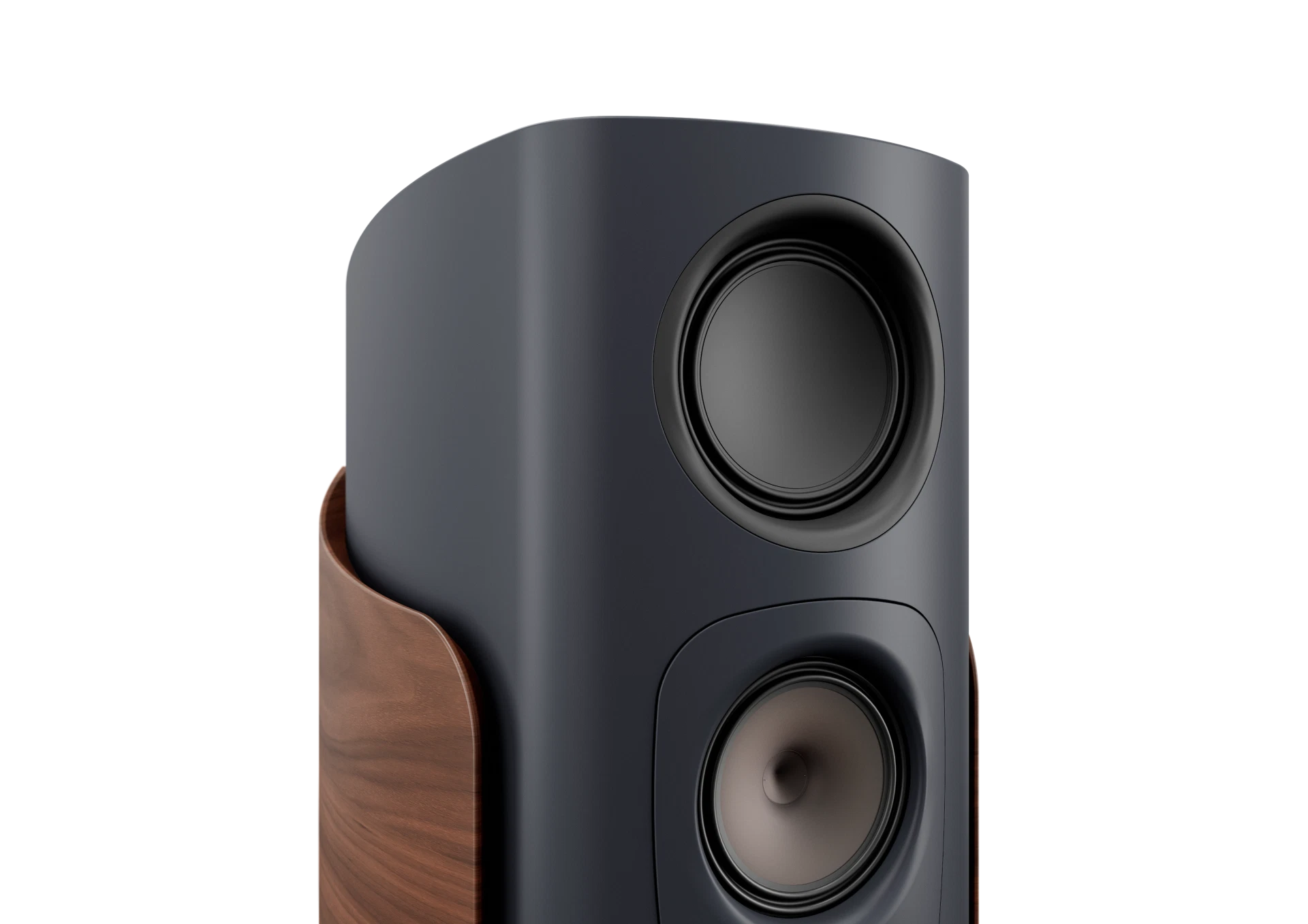 La nuova versione Alpha 1 della serie Reference ne rappresenta il modello di punta: un diffusore da pavimento a 3 vie con sistema bass reflex, che unisce eleganza e potenza. Il mobile, rifinito in laccatura opaca ‘Warm Grey’ o ‘Midnight Blue’, è impreziosito da pannelli laterali in vero noce curvato. I trasduttori midrange e tweeter, dotati di tecnologia Diamond Like Carbon (DLC), assicurano una risposta precisa e naturale. La nuova guida d’onda 3D integrata nella lente acustica migliora la dispersione alle alte frequenze, offrendo un suono uniforme e cristallino.