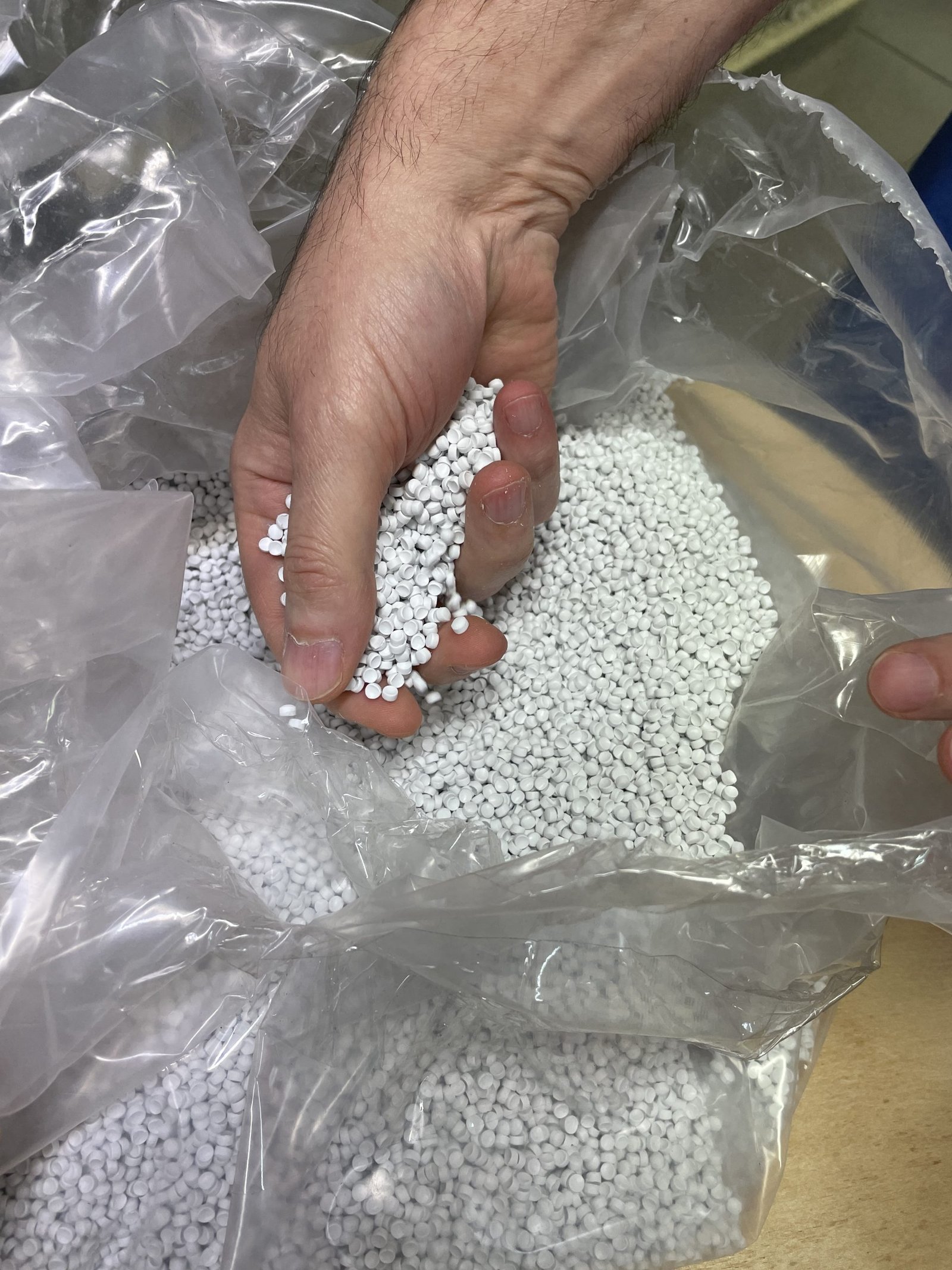 Nella foto, i granuli di glicole polietilenico, la materia prima utilizzata per produrre il dielettrico