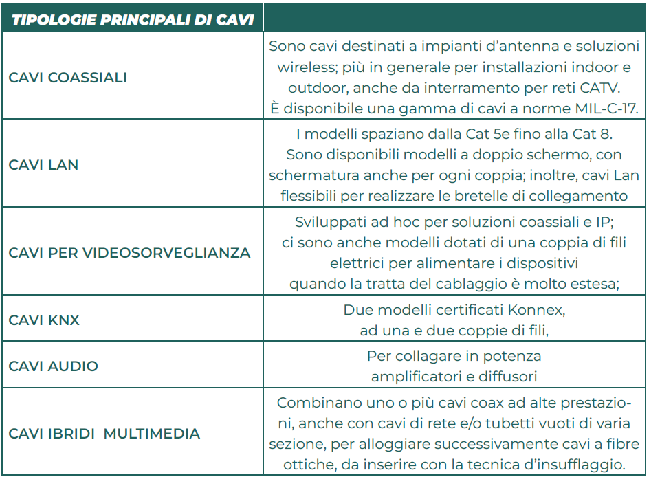 – cavi ibridi e multimedia, che combinano uno o più cavi coassiali ad alte prestazioni, anche con cavi di rete e/o tubetti vuoti di varia sezione, per alloggiare successivamente cavi a fibre ottiche, da inserire con la tecnica d’insufflaggio.
