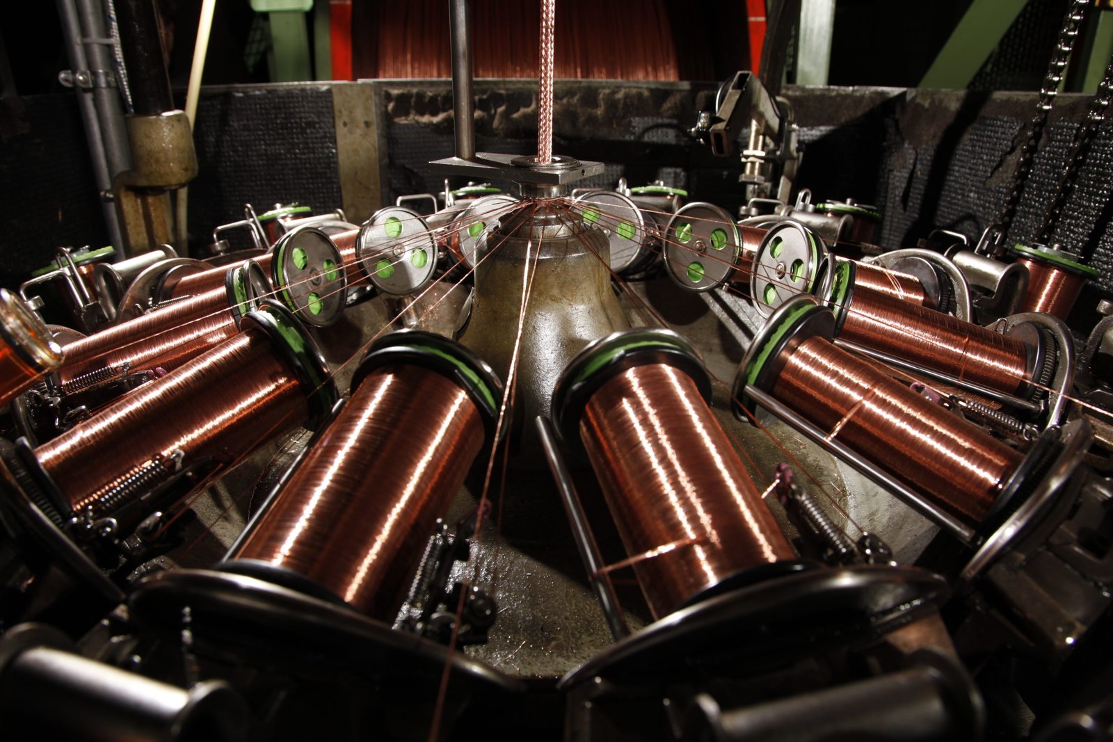 La fase di produzione del cavo coassiale che prevede l’applicazione della treccia di schermatura sul dielettrico.
