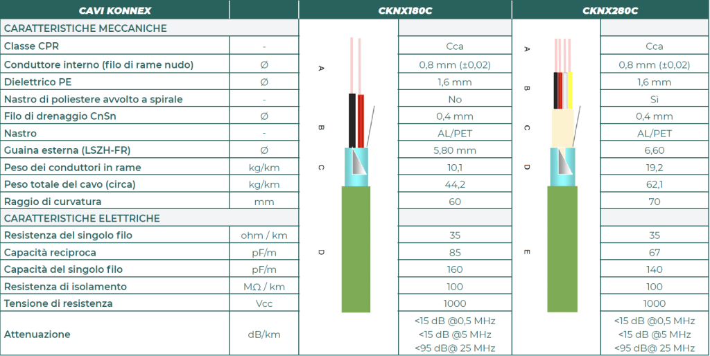 Cavel presenta due tipologie di cavi per soluzioni KNX: CKNX180C con una coppia di fili e diametro esterno da 5,80 mm e CKNX280C con due coppie di fili e diametro esterno da 6,60 mm. Entrambi i modelli hanno una guaina LSZH con classe CPR Cca.