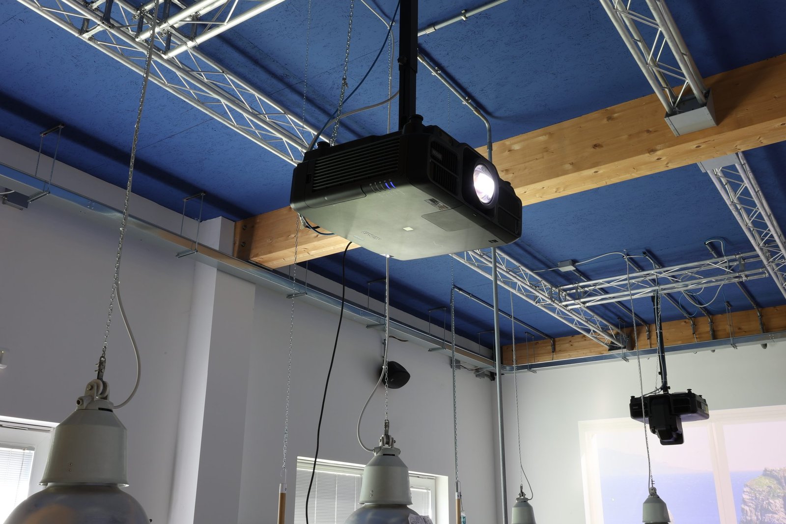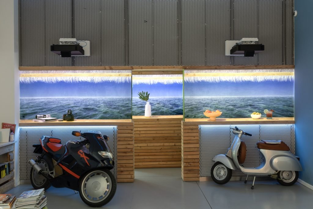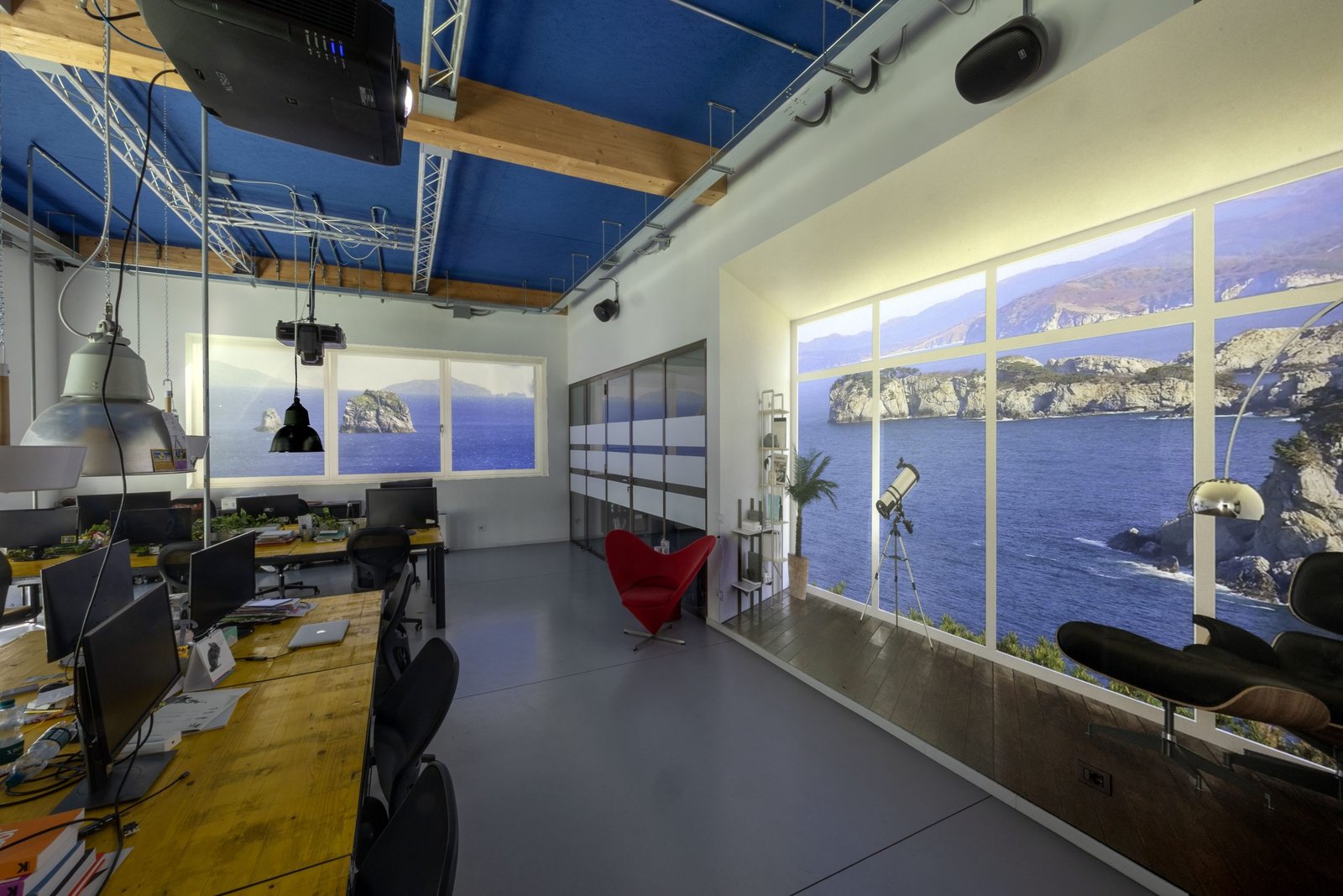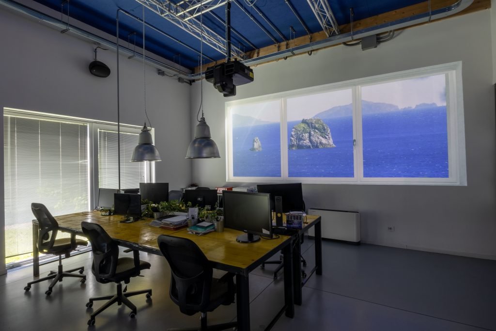«Qui l’obiettivo era coprire una superficie molto più ampia. È stato scelto il modello EB-L1505U di Epson, ad alta luminosità con ottica intercambiabile. La stanza ha ampie finestre rivolte a sud, quindi l’illuminazione è importante. 13.000 lumen per ogni proiettore e ottiche corte hanno permesso di arredare col proiettore le pareti senza invadere l’area lavorativa. L’installazione è operativa mentre le persone lavorano, si ottiene un effetto tridimensionale proiettando un paesaggio oltre una finestra. La dimensione dell’immagine proiettata, infatti, è di circa 6 metri per 4. La struttura di supporto ha delle americane a vista, data anche l’estetica industrial del luogo. Un effetto tecnico visibile voluto»