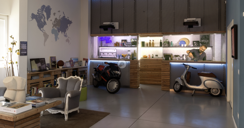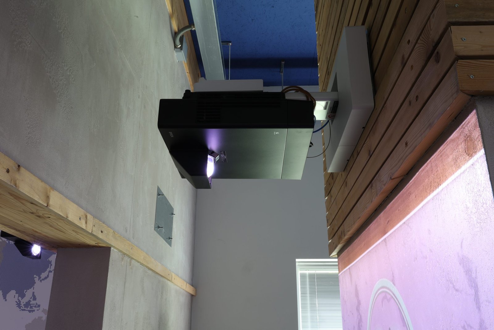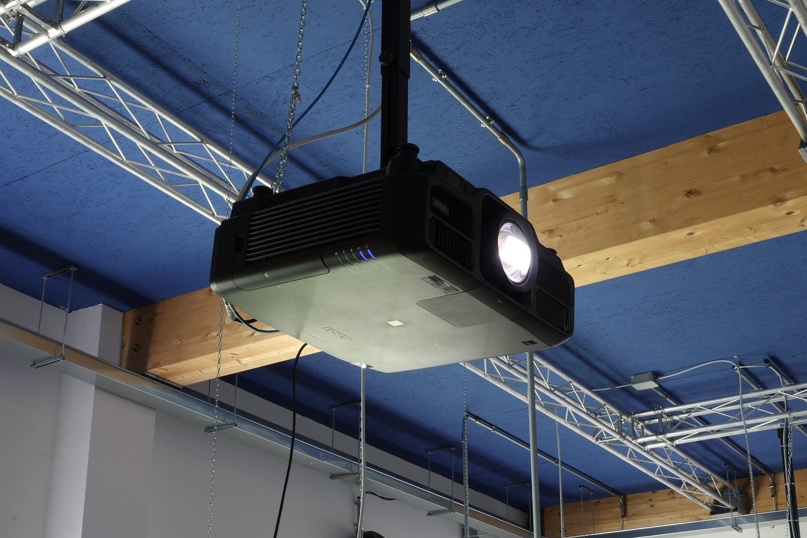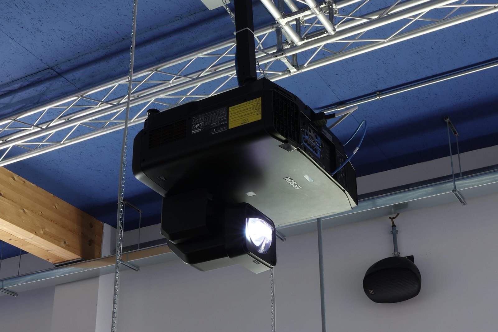 «Qui l’obiettivo era coprire una superficie molto più ampia. È stato scelto il modello EB-L1505U di Epson, ad alta luminosità con ottica intercambiabile. La stanza ha ampie finestre rivolte a sud, quindi l’illuminazione è importante. 13.000 lumen per ogni proiettore e ottiche corte hanno permesso di arredare col proiettore le pareti senza invadere l’area lavorativa. L’installazione è operativa mentre le persone lavorano, si ottiene un effetto tridimensionale proiettando un paesaggio oltre una finestra. La dimensione dell’immagine proiettata, infatti, è di circa 6 metri per 4. La struttura di supporto ha delle americane a vista, data anche l’estetica industrial del luogo. Un effetto tecnico visibile voluto»