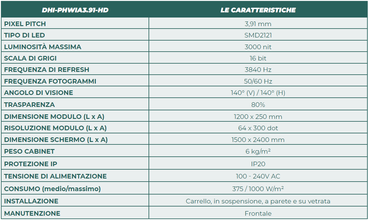 Il nuovo ledwall Dahua DHI-PHWIA3.91-HD appartiene alla categoria dei ledwall trasparenti. È un modello all-in-one da 1,5 x 2,4 metri composto da moduli SMD ad alta risoluzione con oltre 230.000 dot, luminosità da 3000 nit e durata di 100.000 ore. Può essere montato in sospensione, fissato a carrello o direttamente su pareti in vetro garantendo un effetto trasparenza, un’eccellente visibilità e anche il passaggio della luce ambientale.