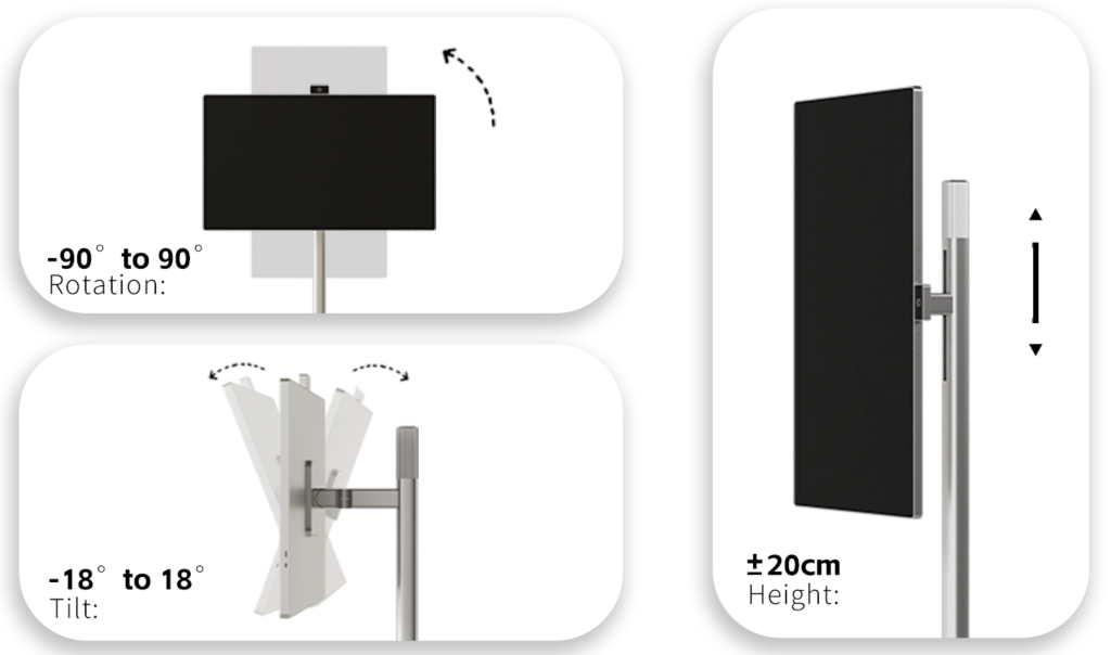 –Display trasportabile con base autoportante. Il display dispone di uno stand autoportante con la batteria integrata nella base;