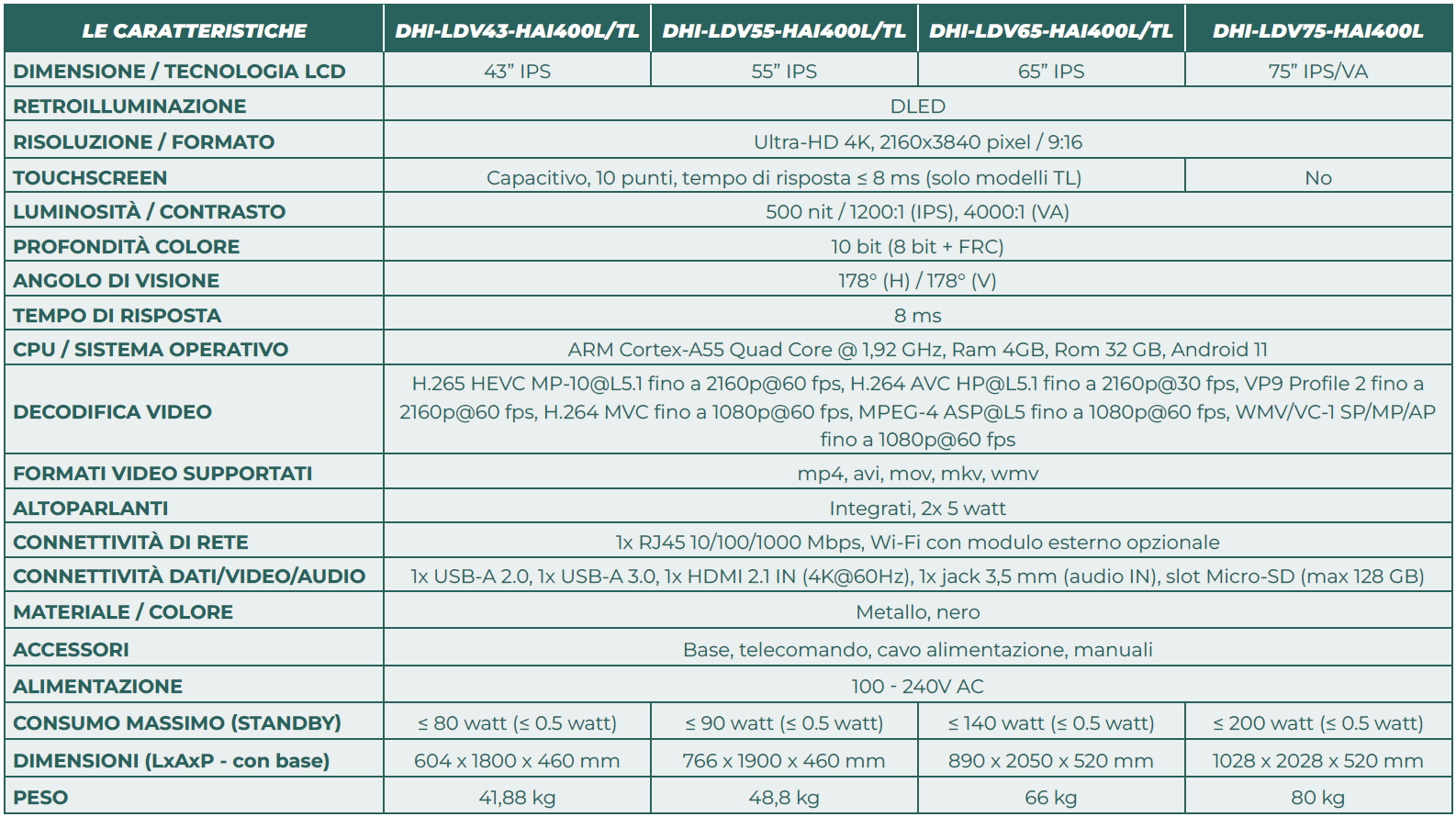 La serie HAI per ambienti indoor comprende i modelli LDV, con display LCD Ultra-HD 4K tradizionale (400L – 43”, 55”, 65” e 75”), e i modelli touchscreen (400TL – 43”, 55” e 65”), tutti in formato 9:16 (portrait).