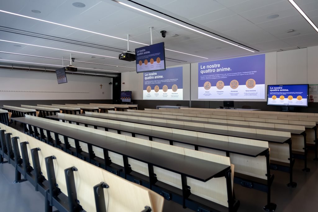 In quell’articolo ci concentravamo sull’impianto audio dell’edificio, progettato non solo per garantire un ascolto ottimale delle lezioni, ma anche per massimizzare l’interattività tra studenti e professori.