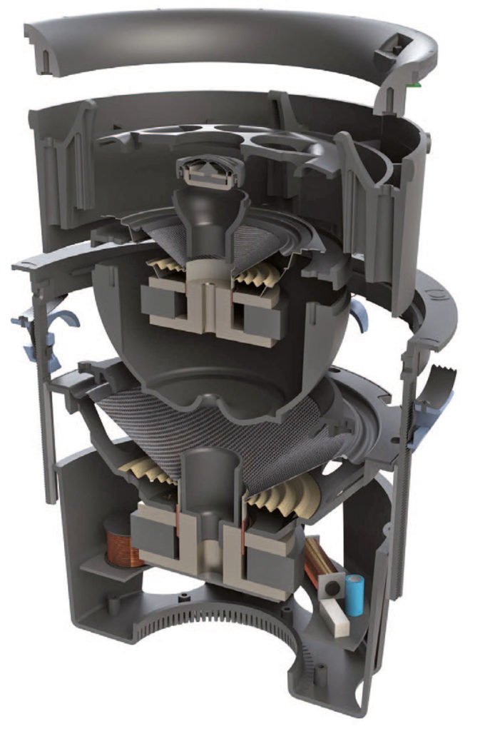 Un tipico tweeter a cupola, in una configurazione coassiale è ancorato soltanto al bordo esterno. Il brevetto di Origin, invece, consente al tweeter di agganciarsi in due punti alla struttura dell’altoparlante: alla bobina mobile e alla sommità della cupola