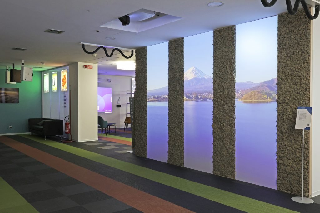 Per terminare la panoramica sugli spazi costruiti intorno alla videoproiezione, Monica Bua ci presenta lo spazio Education: «L’area dedicata alla didattica multimediale è rappresentata da una soluzione immersiva interattiva che si chiama Interactive Teaching System, un sistema chiavi in mano che abbiamo sviluppato insieme a due partner, Screenline e Zebra Multimedia. Parliamo di uno schermo da 6,5 metri di base. Oltre a facilitare l’alfabetizzazione tecnologica, questa soluzione sviluppa una serie di competenze della massima importanza: abilità cognitive, ma anche emotive, di pensiero critico e problem solving. Per quello che abbiamo potuto vedere fin qui, questa modalità ha una presa efficace sui ragazzi, poiché le lezioni risultano più dinamiche, anche per gli alunni con bisogni educativi speciali. Il tutto, poi, è caratterizzato dal massimo efficientamento energetico, grazie al media server che controlla l’infrastruttura».