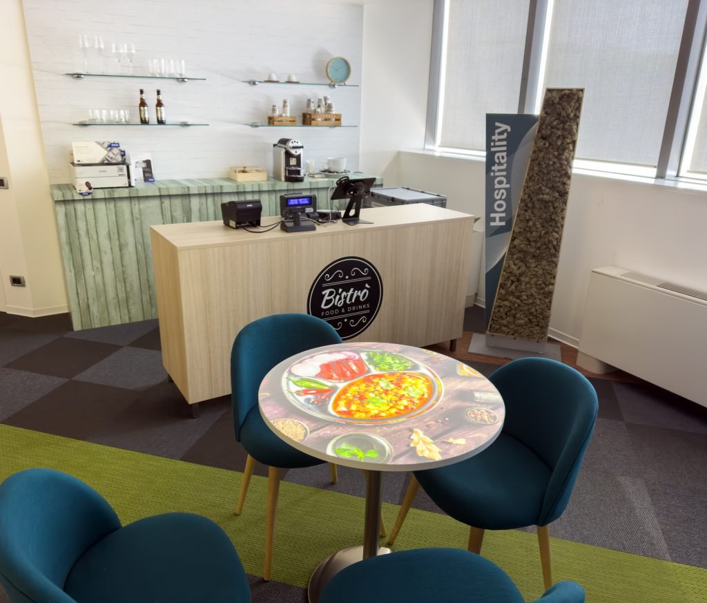 Meritano una menzione anche i settori del Demo Center meno interessati dalla presenza di videoproiettori. Sempre Monica Bua ce li presenta: «Sono spazi meno impattanti ma nei quali la videoproiezione è comunque presente. Prima di tutto la Meeting Room, con un proiettore EB-810E – ultra short throw – con uno schermo ALR e una scrivania semicircolare, a dimostrare il vantaggio di un proiettore come questo per applicazioni di videoconferenza: visualizzare a grandezza naturale sullo schermo le persone che partecipano da remoto, come se stessero sedute di fronte a chi parla».
