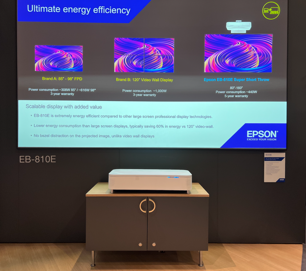 A ISE 2023 Epson presenta il videoproiettore EB-810E portatile dotato di ottica Super Ultra Short Throw con rapporto di tiro da 0,16:1. È stato pensato per soluzioni Digital Signage, Collaboration e Lavoro Ibrido. Certificazione Microsoft Teams Rooms in corso.