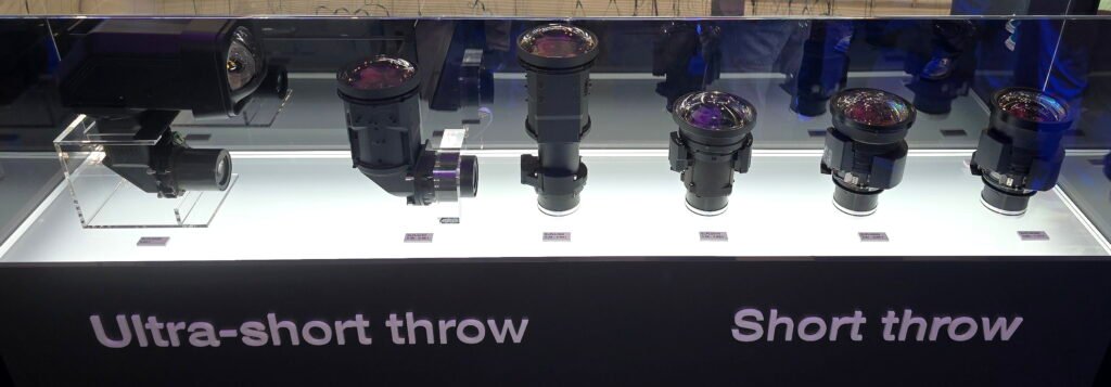L’ottica ultra-corta, come quella a collo di cigno da 0,34:1 nella foto sopra, consente di proiettare immagini di grandi dimensioni a distanza ridotta dalla superficie di proiezione, anche in living e ambienti open space ampi e luminosi, senza compromessi sul contrasto.