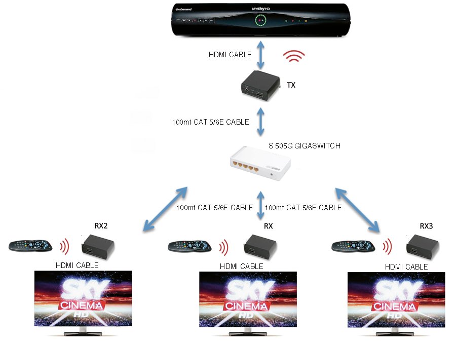 Questa soluzione, visibile nello schema più sotto, si riferisce a un sistema in cui il segnale HDMI di una sorgente viene smistato a più monitor o televisori. Oltre ai due moduli extender FM AMXLP si impiega quindi uno switch gigabit Toto Link S 505G, da 100 Mbps, a cinque porte. Ogni porta dello switch deve essere collegata a un rispettivo ricevitore, del tipo FM AMXLPR. Anche con questa configurazione è possibile la ripetizione del comando a distanza da tutti gli apparecchi tv collegati. Questa configurazione permette di raddoppiare la distanza coperta: a quella che intercorre fra il trasmettitore e lo switch gigabit (massimo 100 metri) vanno aggiunti altri 100 metri massimo fra lo switch e ciascun ricevitore.