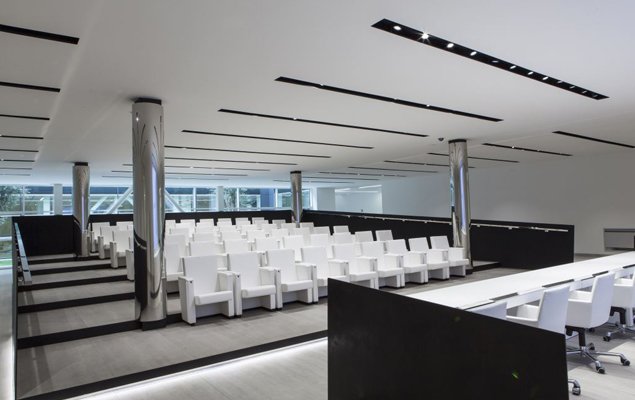 Arredata da sedute in plenaria, nella sala conferenze adiacente sono state collocate le KK102 . In questo ambiente, per il rinforzo nelle zone poste al fondo della sala, la soluzione adottata prevede la collocazione di diversi diffusori ultraminiaturizzati K-array KZ10 (le famosissime Lyzard) nei telai dei corpi illuminanti.