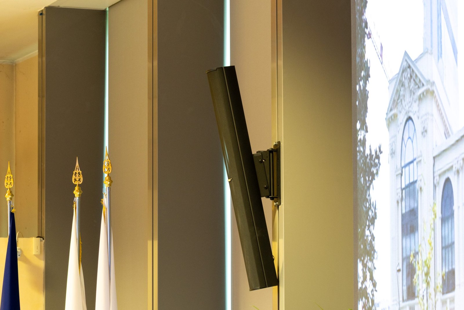 Il sistema è stato configurato per offrire non solo diverse funzionalità, ma anche un’esperienza immersiva. I due subwoofer a pavimento danno corpo al suono e creano un effetto avvolgente, mentre la distribuzione del suono dei Panaray è stata studiata per garantire che, indipendentemente dalla posizione della sala, l’ospite abbia sempre una fonte a destra e una a sinistra da cui proviene l’audio, su tutte le sedute del tavolo ovale. I diffusori a soffitto, dal canto loro, garantiscono il rinforzo dell’audio locale: quando un relatore parla al microfono, la voce viene restituita dai diffusori a soffitto, mantenendo chiarezza e uniformità.