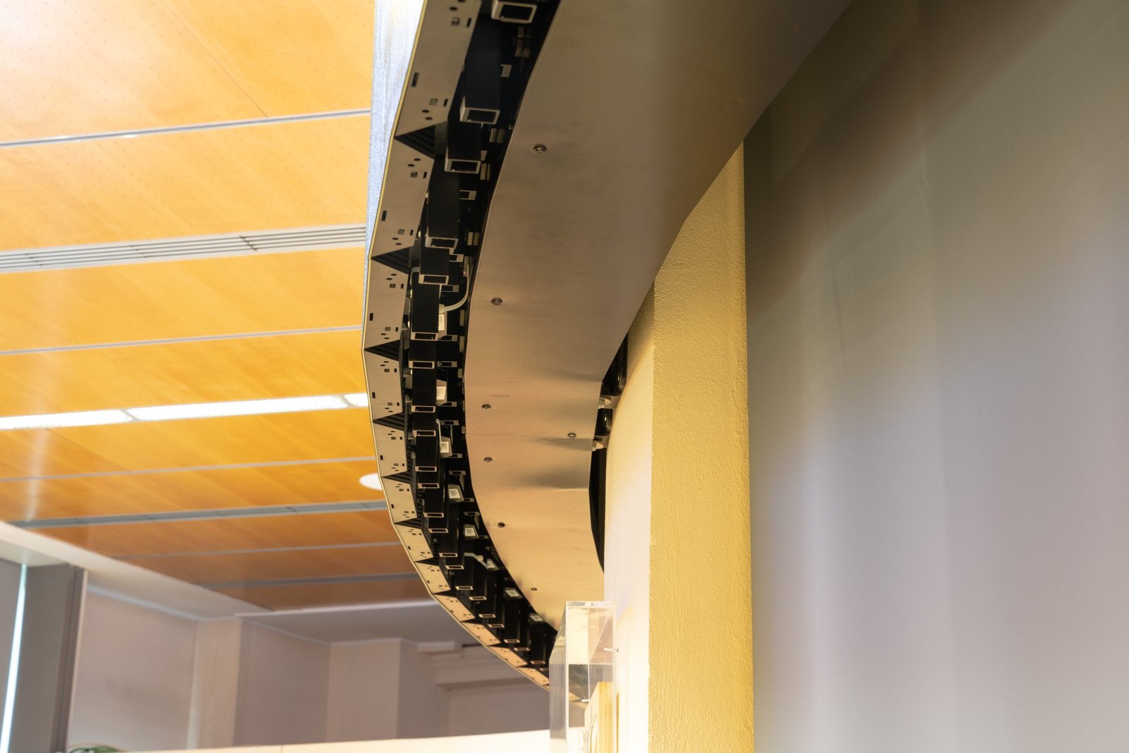 Negli ultimi anni, la sala ha iniziato a mostrare la necessità di un rinnovamento: le tecnologie non erano più adeguate a garantire un’esperienza meeting di qualità, che fosse funzionale, ma anche immersiva ed emozionale. Da qui la decisione di avviare nel 2024 una ristrutturazione completa di questo spazio, dotandolo sul fronte video di due ledwall Samsung – uno curvo e uno piatto – progettati su misura in base alla complessa geometria della sala, affiancati da monitor di supporto e da un impianto di telecamere per una gestione fluida delle inquadrature; sul fronte audio un sistema Bose Professional assicura un’esperienza immersiva grazie a diffusori a soffitto DesignMax, line array Panaray e subwoofer di rinforzo.