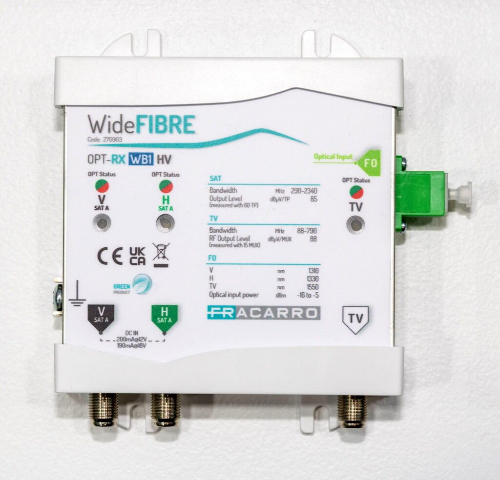 Il modulo OPT-RX WB1 HV converte il segnale ottico proveniente dal trasmettitore OPT-TX WB1 in segnale coassiale. Dispone di tre uscite: due polarità satellitari wideband (V/H) e un’uscita TV terrestre. Integra tre fotodiodi distinti per la gestione separata delle due polarità wideband e del segnale TV.