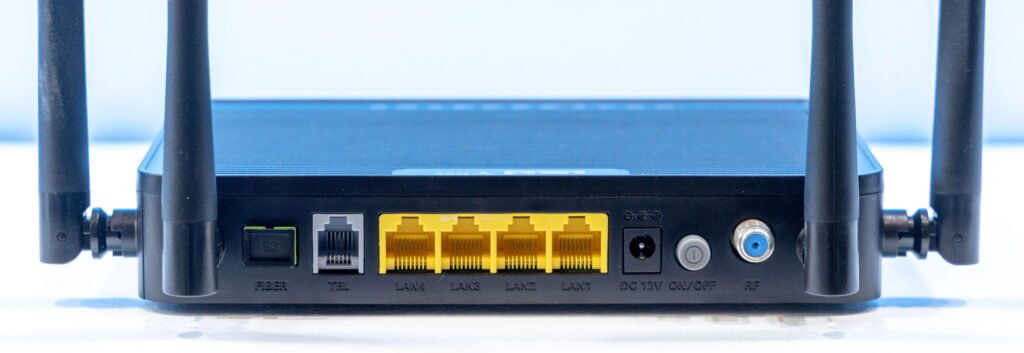 Integra inoltre due porte FXS (POTS – RJ11) per telefonia analogica/VoIP. È conforme allo standard FSAN ITU-T G.984.2 e supporta velocità asimmetriche di 1,25/2,5 Gbps.