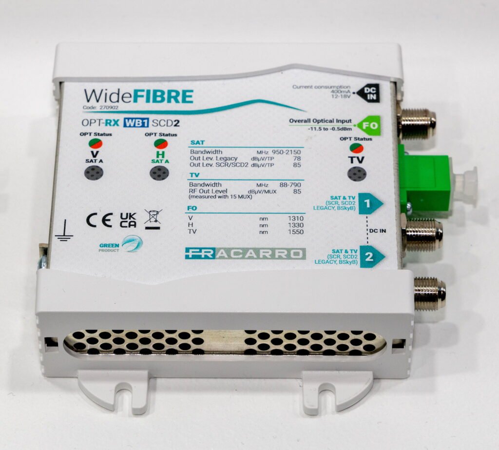 Il ricevitore OPT-RX WB2 SCD2 converte il segnale ottico proveniente dal trasmettitore OPT-TX WB2 in segnale coassiale, con due uscite SCD2 multistandard (SCR/dCSS/dSCR-BSkyB e legacy) e segnale TV miscelato.