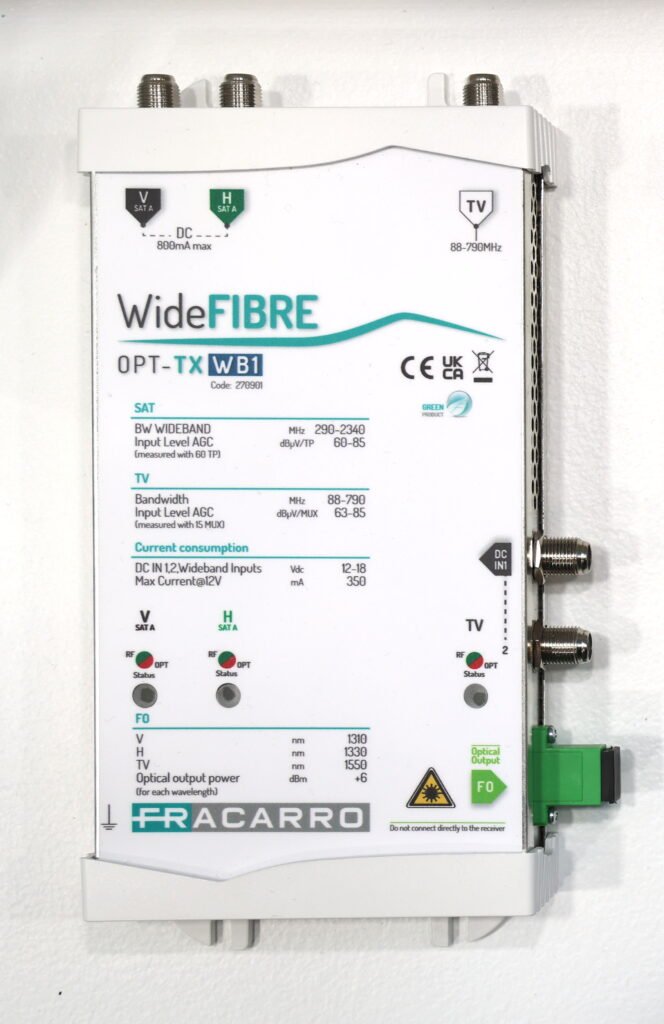 Integra tre laser distinti, in grado di gestire separatamente le due polarità wideband e il segnale TV terrestre. Come gli altri moduli WideFibre, utilizza la tecnologia CWDM (Coarse Wavelength Division Multiplexing) per combinare le diverse lunghezze d’onda e trasmetterle su un’unica fibra ottica monomodale 9/125 µm.