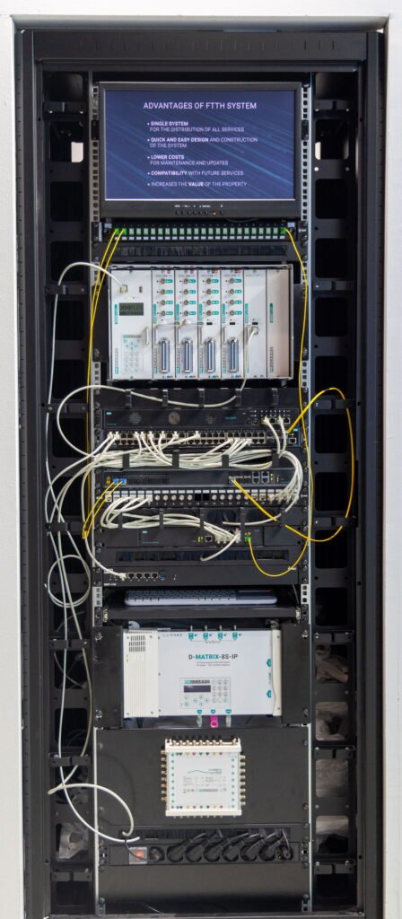 Nello stand era presente un rack, tipicamente installato nell’area tecnica della struttura, che ospitava Core Switch, OLT, controller, tre centrali di trasmodulazione (vedi sotto) per la distribuzione dei segnali TV, su cavo coassiale tradizionale o in IPTV, e altri dispositivi.