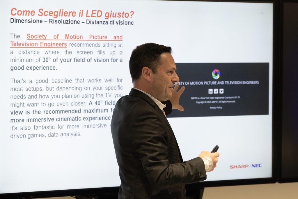 A FUTUROPRESENTE, Sharp NEC ha presentato schermi Ledwall di diversa tipologia. Enrico Sgarabottolo, General Manager TIGI di Sharp NEC Display Solutions Europe, durante il suo intervento ha passato in rassegna le diverse tecnologie che contraddistinguono i ledwall prodotti dall’azienda, evidenziando per ciascuna i contesti applicativi ideali e le prestazioni richieste. Non solo quindi dimensione del pixel, risoluzione e distanza di visione, ma anche un approfondimento sulle tecnologie utilizzate per la realizzazione dei moduli led, come ad esempio: SMD (la più diffusa), SMD flip chip, GOB, COB (Chip On Board) e COB flip chip. Quest’ultima garantisce un angolo di visione più ampio, una migliore dissipazione termica, consumi energetici significativamente ridotti e livelli di luminosità ancora più elevati. Ricordiamo che Sharp NEC produce anche una vasta gamma di proiettori e monitor, anche interattivi come i Big Pad, e i display ePaper.