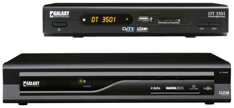 La gamma Galaxy di decoder DTT è composta da 4 modelli: DT 3701 MHP con card Mediaset Premium compresa, DT 3502 zapper multimediale, DT 3501 zapper e DT3504 con scart che ruota su due assi. Il DT3701, MHP interattivo, è in grado di decodificare i servizi di Mediaset Premium. Le Scart sono due ed è presente anche il loop throught per l’antenna. Gli zapper, invece, sono 3, semplici nell’utilizzo ma diversi nelle prestazioni. Nel modello DT3502 è presente tutto quello che serve per ricevere i canali DTT, con l’aggiunta delle funzioni base per Hotel come la protezione avanzata per l’accesso ai Menù e il blocco di visione. Il DT3501, più performante, è dotato di display, lettore di Card multimediali e porta USB2 frontale, per riprodurre immagini jpeg, file audio MP3, file video MP4 e DivX, memorizzati in una chiavetta oppure in un hard disk collegato. Le funzioni LCN, EPG, Televideo, Sottotitoli e Timer completano il quadro delle prestazioni. In caso di mancanza di corrente di rete, questi modelli memorizzano l’ultimo canale selezionato. Infine, sul frontale sono presenti i tasti On e cambio canale, per utilizzare le funzioni base dei decoder anche senza telecomando.