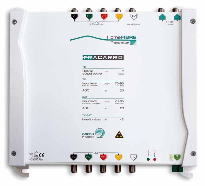 La soluzione proposta da Fracarro presenta numerosi vantaggi. Innanzitutto la categoria dei prodotti è di livello professionale, con un livello di affidabilità conseguente; si tratta di componenti capaci di lavorare ininterrottamente, anche in condizioni ambientali e climatiche sfavorevoli. La configurazione mista, coassiale+fibra, nei nuovi impianti consente di utilizzare l’LNB standard mentre negli impianti da adeguare evita la sostituzione del convertitore con uno di tipo ottico. Inoltre, per quest’ultima tipologia di impianti, basterà sostituire ad ogni piano il multiswitch presente con un trasmettitore Home Fibre e cablare la linea derivata in fibra ottica. Utilizzando splitter a due e quattro vie si possono realizzare impianti con un numero molto elevato di prese di utente, fino a 1792. Il modulo ricevitore, che converte il segnale ottico in coassiale, offre quattro uscite coassiali indipendenti, di tipo universale. Infine, la distribuzione dei segnali riguarda sia quelli satellitari che DTT.