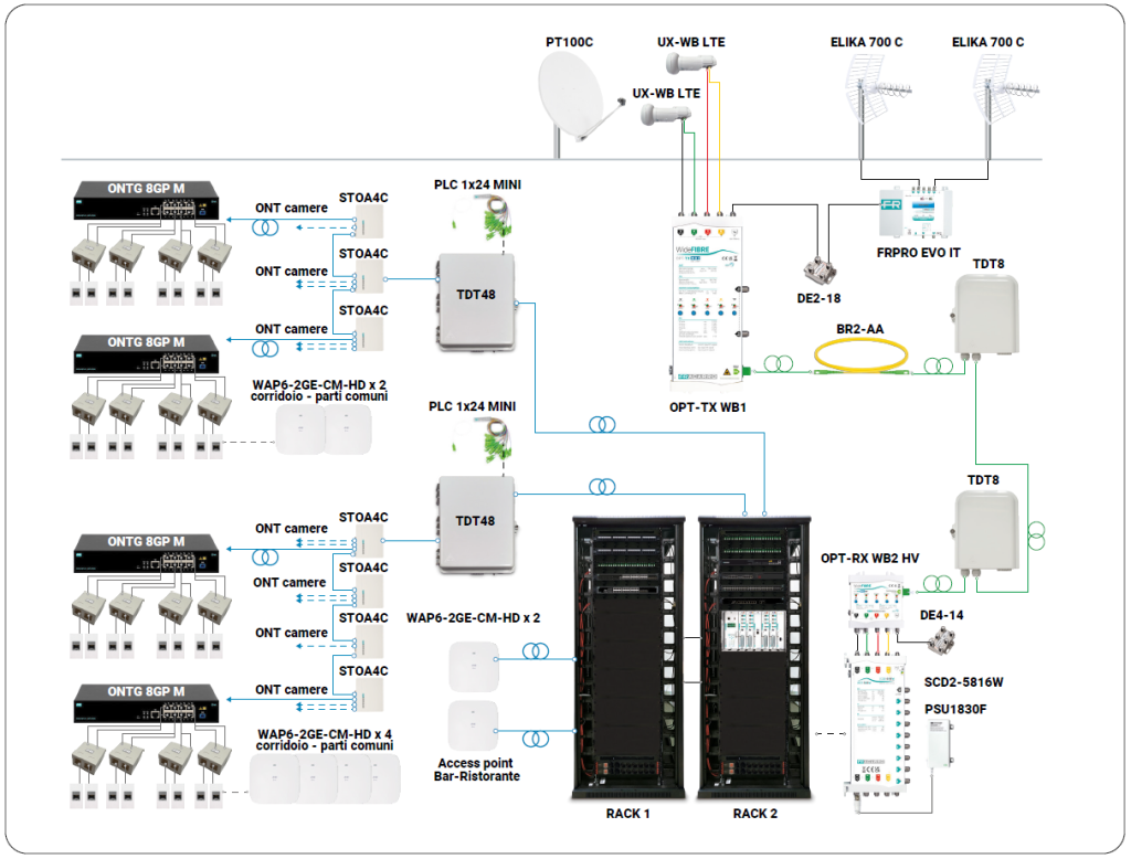 Di recente l’attuale proprietà ha scelto di trasformarlo in un hotel moderno e funzionale, dotato della tecnologia e dei servizi che la clientela oggi si aspetta da una struttura ricettiva di livello. Per questo, si è deciso di dotarlo di un sistema di ricezione TV satellitare e terrestre e di una rete GPON, soluzione che consente la distribuzione dei servizi assicurando prestazioni elevate, gestione flessibile e future-proof.