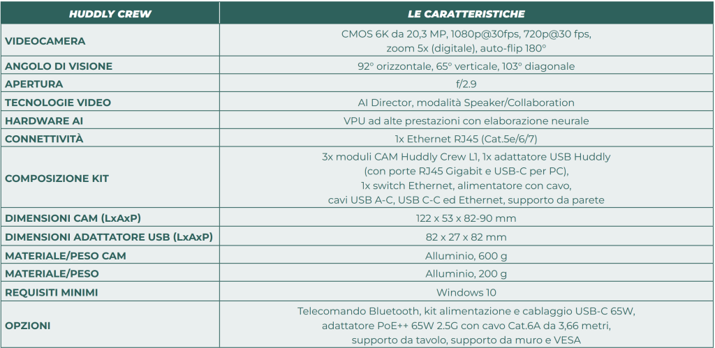 Il sistema Huddly Crew si distingue principalmente per le peculiarità che seguono.