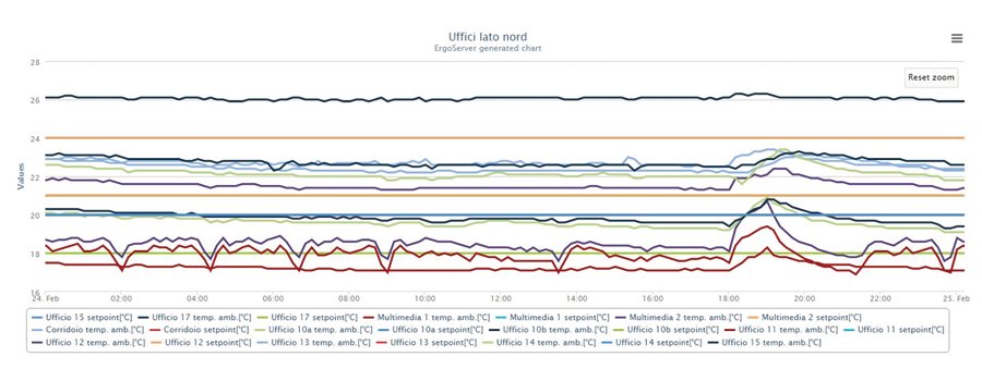 Osservando i grafici di Figura 1 e 2 appare evidente che nelle ore notturne il grafico delle temperature si mantiene più o meno piatto, quindi sembra che durante le ventiquattrore non vi sono interruzioni del riscaldamento, nemmeno la notte. Osservando però il brusco impennarsi delle temperature dopo le 18:00 sembra che, in effetti, vi sia una cosiddetta ‘accensione’ programmata del riscaldamento, che si riflette sia negli uffici lato nord che in quelli lato sud, qui in maniera ancora più evidente. Sembra quindi che l’impennata del grafico evidenzi un riscaldamento per circa un’ora, che poi di nuovo si interrompe. Una situazione perlomeno contraddittoria.