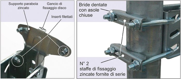 Il supporto in robusta lamiera zincata è dotato di un “gancio” che mantiene in posizione il disco senza doverlo tenere con le mani. Gli appositi inserti filettati che sostituiscono i dadi consentono all’installatore di poter effettuare le operazioni di serraggio in modo semplice, potendo operare da un solo lato. Per il fissaggio al palo l’AZ-EL è fornito di due robuste staffe zincate con possibilità di ancoraggio a diametri da 32 a 60 mm. Non è stata trascurata nemmeno la possibilità di installazione con palo passante che è consentita con un’elevazione massima di 43°. La NEW TECH da 80 cm di diametro è disponibile in acciaio e alluminio di colore bianco, antracite e mattone. Ricca anche la dotazione di accessori per l’installazione di impianti dual e multifeed.