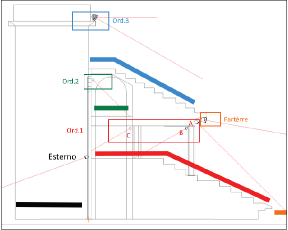 La suddivisione in aree della tribuna: una parte più alta ed esposta (Ordine 3), una galleria (Ordine 2) e infine una parte di tribuna più bassa che dalla galleria arriva fino al parterre (Ordine 1).