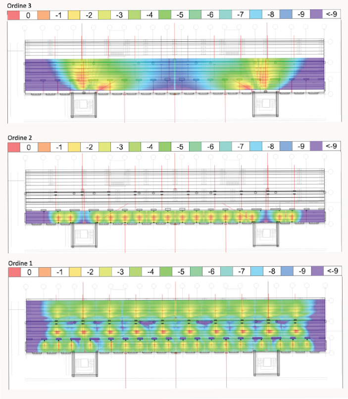 Uniformità della copertura acustica nelle diverse aree della tribuna, SPL diretto tra 1KHz e 4kHz – le aree più scure non necessitavano di copertura acustica.