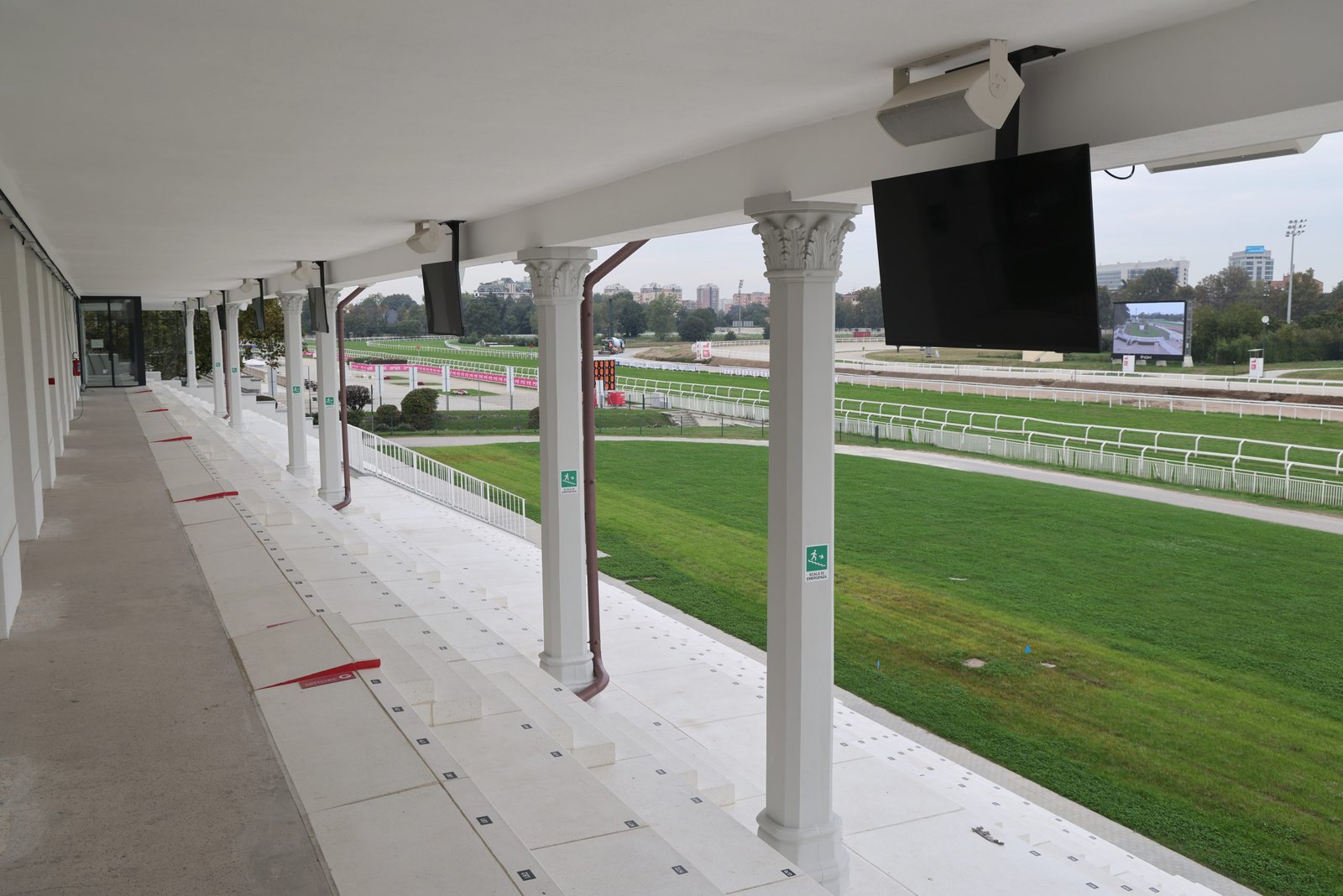 La tribuna del trotto, interamente restaurata. Si notino le due torri su cui sono stati installati i diffusori ArenaMatch che portano l’audio alle sedute più elevate.
