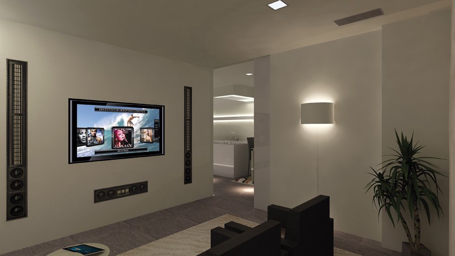 speaker Bay Audio a scomparsa nel controsoffitto e subwoofer a parete.