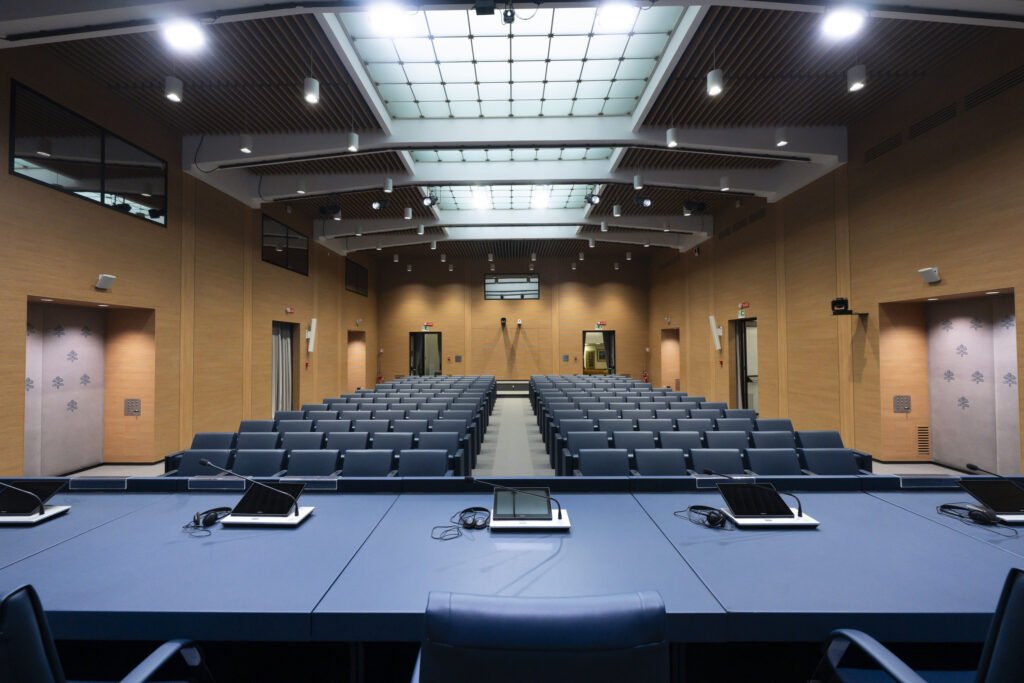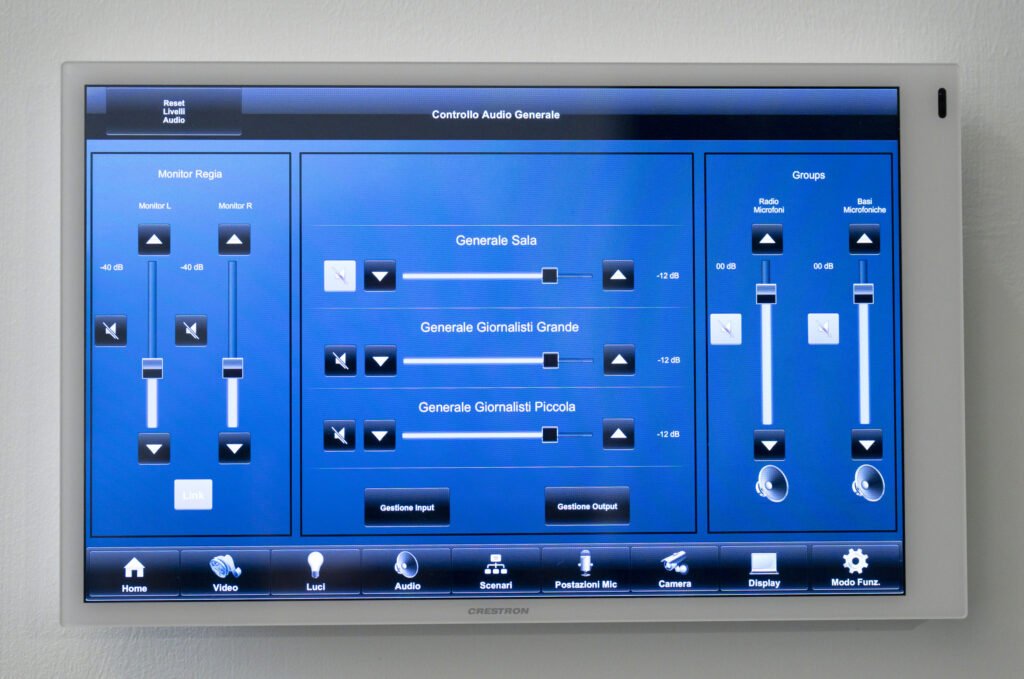 La soluzione che abbiamo messo a punto comprende l’impianto audio della sala stampa e delle aree dedicate ai giornalisti accreditati, interamente affidato all’ecosistema Bose Professional, la creazione di sedute dotate di un sistema di traduzione simultanea fino a 150 lingue, la cura del lighting di sala, il posizionamento delle telecamere e la gestione domotica dell’intero sistema tramite touchscreen.