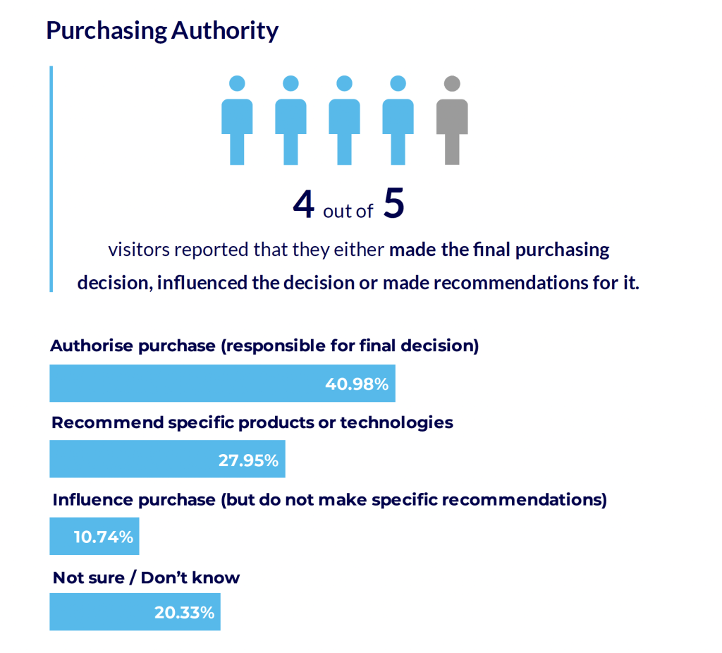 Una delle evidenze emerse è che 4 visitatori su 5 hanno dichiarato di essere responsabili della decisione finale di acquistare o di poter influenzare questa decisione (figura 3), e tra questi poco meno della metà (40,98%) è composta da responsabili in prima persona dell’acquisto, con diversi ruoli aziendali (dagli amministratori delegati ai manager) e differente potere d’acquisto; a questo proposito un’ulteriore sottolineatura: il report rileva che in un caso su 4 l’azienda può permettersi una spesa annua di più di 1.000.000 dollari nel settore AV.