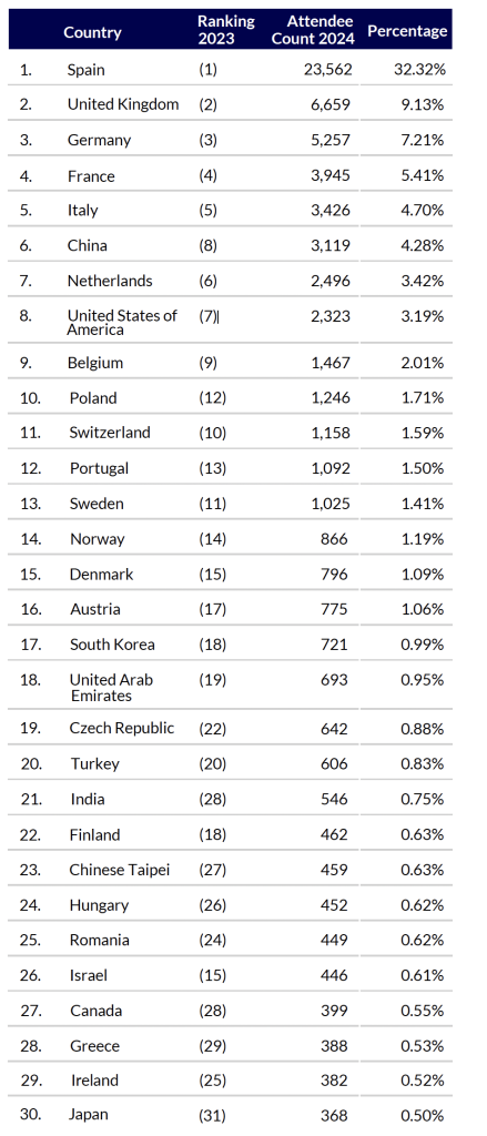 Molti paesi hanno registrato un aumento significativo del numero di partecipanti, tra cui importanti territori del mercato AV del Nord Europa come Germania (26,3%), Belgio (31,8%), Polonia (40,2%), Svizzera (20,0%), Norvegia (22,0%) e Austria (27,5%). Come possiamo vedere nella tabella, complice ovviamente il fatto che sia proprio Barcellona la città ospitante, la Spagna è il Paese con più visitatori ed espositori, da dove proviene quasi la metà dei nuovi visitatori. Poiché, per fortuna, le restrizioni di viaggio degli scorsi anni sono superate, si è registrato anche un forte aumento – 136% – dei visitatori cinesi.
